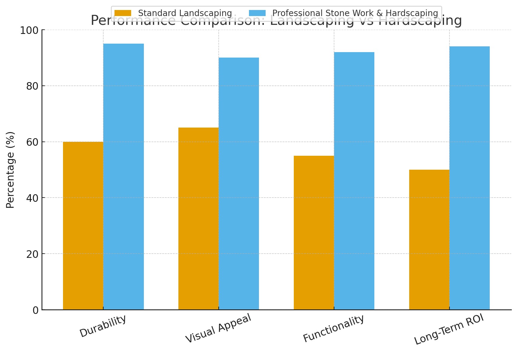 This data emphasizes how professional hardscaping significantly outperforms standard landscaping when considering durability, aesthetics, and long-term property value.