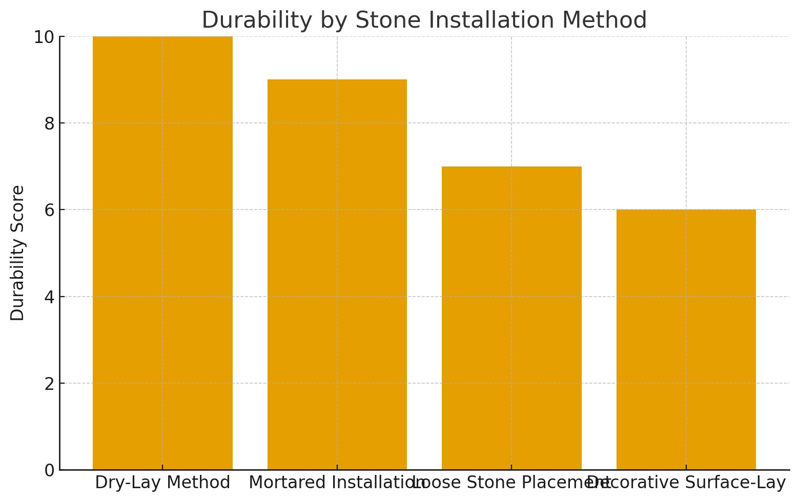 Dry-lay installation ranks highest because it offers excellent flexibility and resistance to shifting. Mortared stone installations offer strong bonding and a clean finish. Loose stone designs provide visual charm but may shift more easily. Decorative surface-lay designs are typically chosen for aesthetics rather than structural strength.